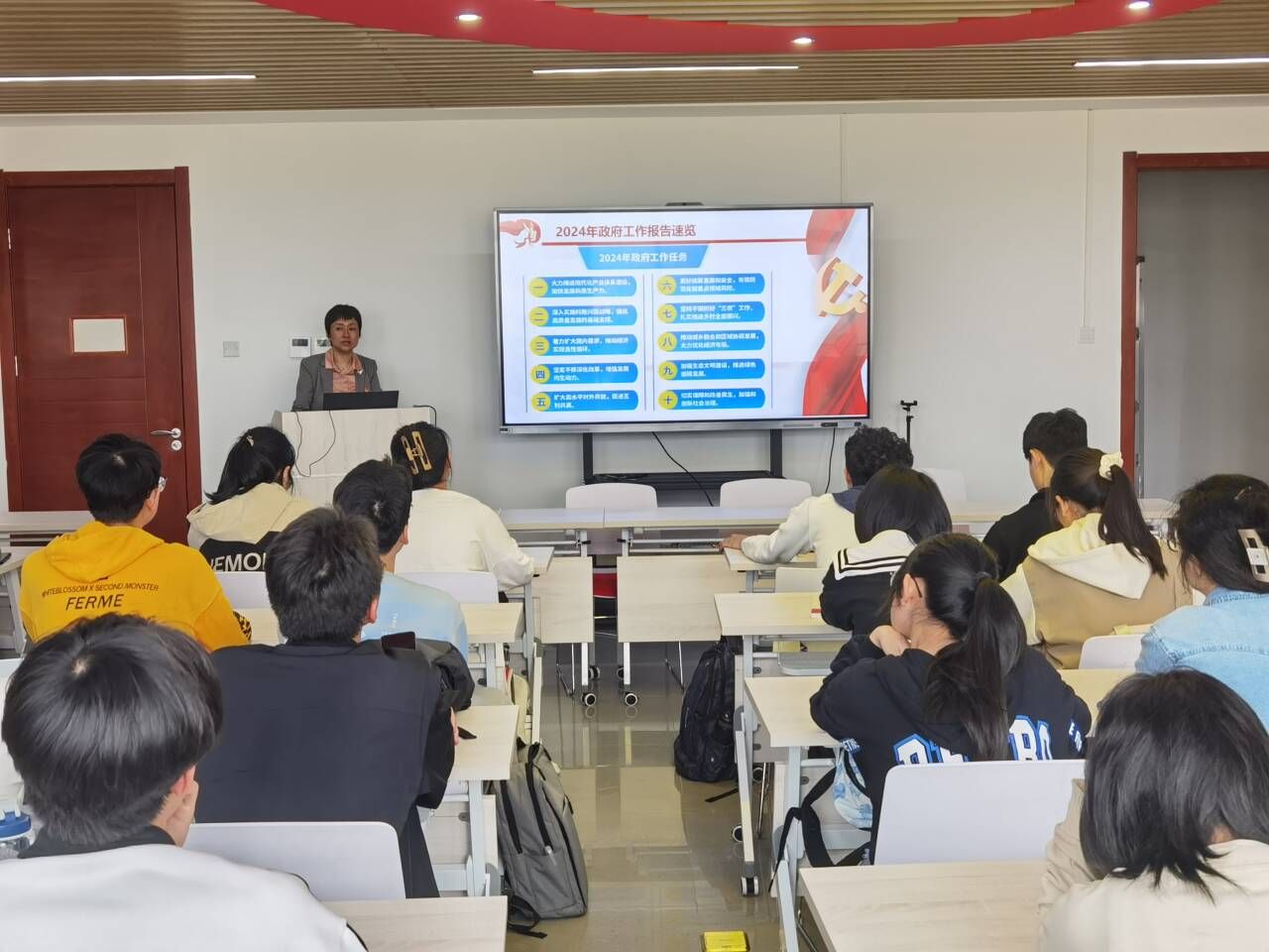 伴随着国际歌的旋律,开班仪式结束。学院党委书记、分党校校长巩惠玲以学习两会精神为主题向党校学员讲授第一堂党课。巩惠玲重点解读了2024年政府工作报告,介绍了2023年工作回顾、2024年经济社会发展总体要求和政策取向以及2024年政府工作任务。