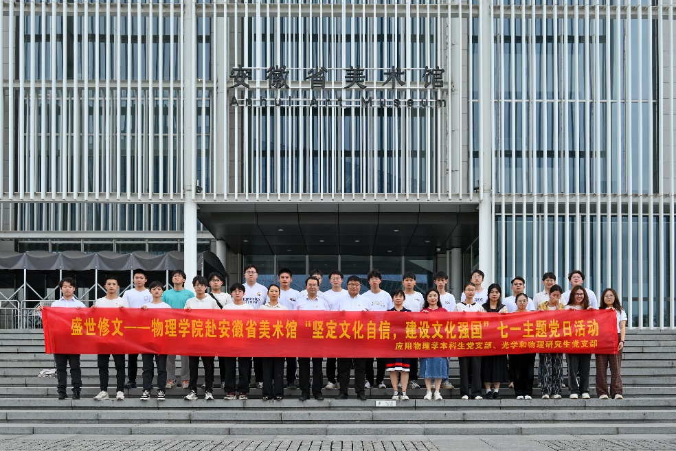为扎实推进主题教育,学习习近平总书记在文化传承发展座谈会上的重要讲话精神,6月25日下午,pp电子游戏平台官网组织赴安徽省美术馆开展“坚定文化自信,建设文化强国”七一主题党日活动。学院党委委员、应用物理学本科生党支部、光学和物理研究生党支部师生党员40余人参与活动。