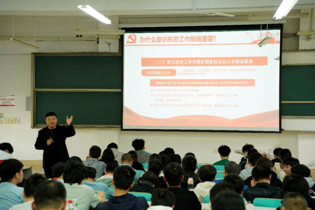 陈大为介绍了意识形态的内涵以及社会科学、社会主义文艺、宣传思想工作、新闻舆论工作等主要意识形态阵地,引导同学们认识意识形态工作的重要性。 最后引申补充了关于坚定理想信念、维护国家安全等相关内容。叮嘱同学们自觉坚守意识形态底线,坚守意识形态阵地,增强“四个意识”、坚定“四个自信”、做到“两个维护”,切实维护国家安全。