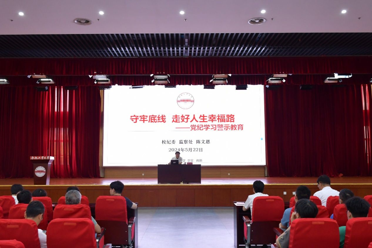 为进一步高标准高质量推进党纪学习教育,以良好作风保证党纪学习教育走深走实,5月22日pp电子游戏平台官网在翡翠科教楼A座学术报告厅举行党纪学习教育专题辅导报告会。校纪委副书记、纪委办公室主任、监察处处长陈文恩应邀作了主题为《守牢底线 走好人生幸福路》的党纪学习警示教育专题报告。