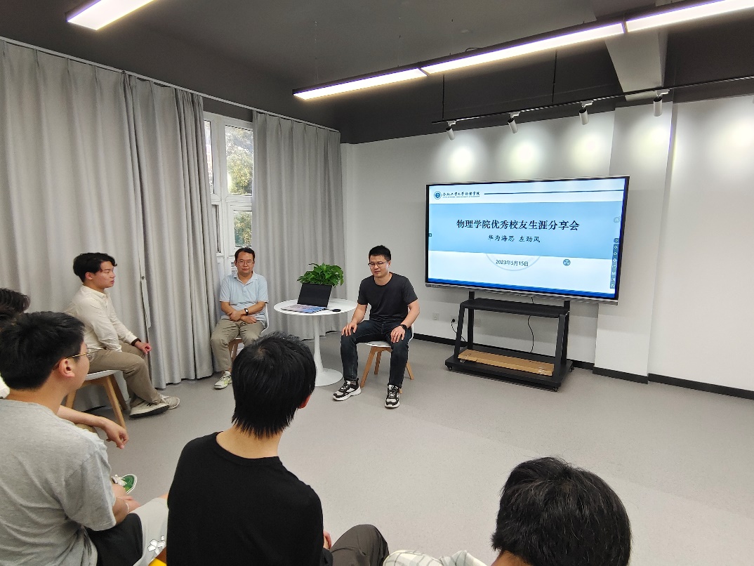 左劲风首先分享了自己的成长经历,他从自己在本科期间参加大创项目的经历讲起,结合应用物理学专业学科特点,介绍了自己一步一步成长为工程师的经验。左劲风在沙龙中给学弟学妹们提出殷切的希望,建议他们要在学习时找准自己的兴趣点并坚持奋斗,要相信自己的实力不要轻言放弃,要有家国情怀、树立远大理想、学会“自找苦吃”。
