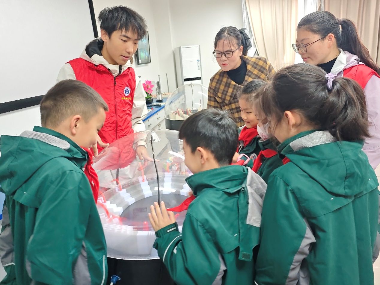 此次“科技点燃梦想”少先队共建活动内容丰富多样。在翡翠湖校区大数据报告厅,pp电子游戏平台官网大学生党团员志愿者们为少先队员们讲述了一堂生动的“科学家故事课”,介绍了科学家精神,不仅激发了少先队员们对科学家的敬仰之情,更在他们心中种下了追求科学真理、担当时代责任的种子。在大学物理演示实验室,志愿者们带领少先队员近距离感受物理实验的奥秘与魅力,在志愿者的悉心指导下,少先队员们亲手体验科普实验,不仅领略了科学的神奇之处,还增强了自身的科学素养与探索兴趣。