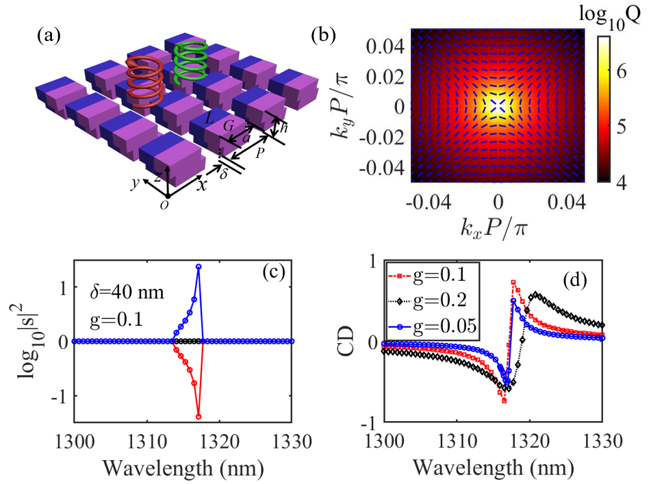 图 (a) PT对称手性超表面结构。(b) 非厄米参数为零时动量空间BICs投影偏振矢量场及品质因子。(c) 散射矩阵本征值。(d) 超表面的圆二色透射谱。