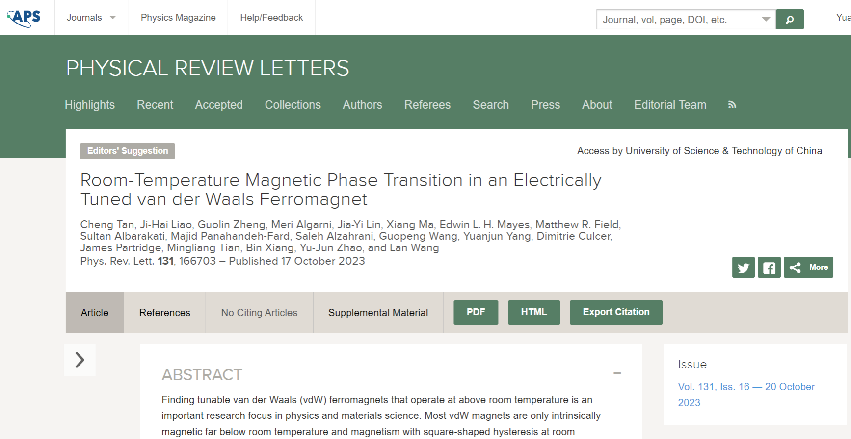 近日,pp电子游戏平台官网王澜教授带领的低维磁性与自旋电子器件研究团队在范德瓦尔斯磁性晶体磁相变的电学调控研究中取得新进展,初步研究结果以“Room-Temperature Magnetic Phase Transition in an Electrically tuned van der Waals Ferromagnet”为题发表在物理学著名期刊Physical Review Letters上发表,并被选为“编辑推荐”(Editors’ Suggestion)论文。