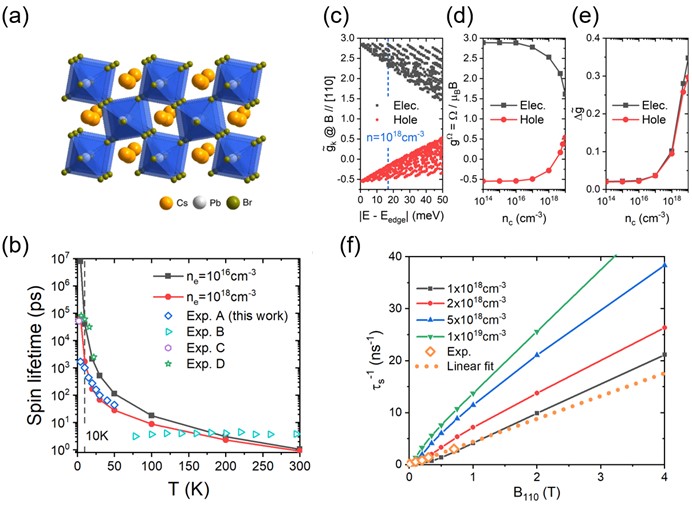 团队采用自主开发的第一性原理密度矩阵主方程方法,模拟了一种典型卤化钙钛矿--CsPbBr3(图1a)的自旋弛豫时间(T1,见图1b)和系综自旋退相位时间(T2*,见图f)。该方法准确地考虑了自洽的自旋轨道耦合(SOC),并包含对电子-声子散射过程的量子描述。因此,团队精确预测了材料的本征自旋寿命(见图1b),从而设定了自旋寿命的上限,并研究了自旋寿命对温度、外场、载流子密度和缺陷的依赖性。团队进一步确定了CsPbBr3的自旋弛豫机制,其中,发现主导载流子弛豫的Frohlich电声相互作用对自旋弛豫的贡献却可以忽略不计。该现象起源于Frohlich电声相互作用的自旋弱相关性。团队还实现了对固体中Lande g因子的第一性原理模拟(见图1c、1d、1e),并将其引入到自旋动力学模拟中,这使得团队能够准确模拟在外场下的自旋退相位现象(见图1f)。最后,团队研究了空间反演对称性破缺对自旋寿命的影响。理论结果表明,当自旋劈裂较大时,所谓的“永久自旋螺旋”可以提高自旋寿命,然而Rashba自旋-轨道耦合场却会降低自旋寿命。团队的理论方法为优化卤化钙钛矿材料的自旋和载流子输运性质提供了新的途径。