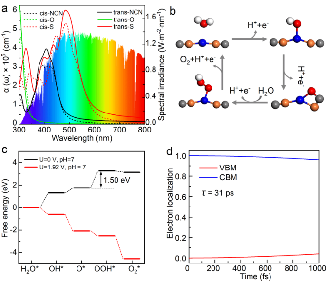图2:(a) 顺式和反式 Cu2C4X4 (X =NCN , O, S) 的光吸收系数。彩色区域表示空气质量为 1.5 时的参考太阳光谱辐照度。(b) 顺式 Cu2C4(NCN)4 上能量最有利的吸收中间体 (OH*、O* 和 OOH*) 与水氧化半反应的拟议光催化途径。 灰色、蓝色、橙色、红色和白色球分别代表 C、Cu、N、O 和 H 原子。(c) 不同条件下顺式 Cu2C4(NCN)4 上 OER 的自由能图。(d) 顺式 Cu2C4(NCN)4 的时间相关电子布居。