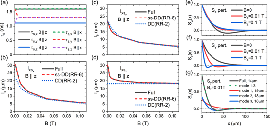 图1:石墨烯-氮化硼自旋弛豫和扩散长度的磁场效应。(a)自旋寿命的磁场效应。(b)-(d)不同方向自旋扩散长度的磁场效应。(e)-(g)不同边界条件和磁场下的自旋空间演化。“Full”表示求解完整本征值方程得到的结果。“DD”表示传统漂移-扩散关系式。“ss-DD”表示考虑了不同自旋自由度之间耦合的漂移-扩散关系式。由图可见,由于考虑了耦合动力学,“ss-DD”近似式精确描述了石墨烯-氮化硼的自旋扩散。