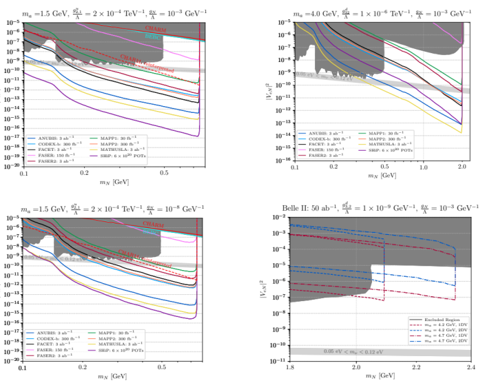 Figure 2 presents some of the numerical results obtained in this study. In the upper-left and upper-right panels, the authors fixed the ALP masses at 1.5 GeV and 4.0 GeV, respectively, considering promptly decaying ALPs produced from D-meson and B-meson decays. The sensitivity of the LHC far-detector experiments is displayed in the (HNL mass, square of the neutrino mixing strength) plane. In the lower-left panel, the authors considered an ALP mass of 1.5 GeV produced from D-meson decays, with, however, a long-lived ALP. These results suggest that, within the theoretical scenarios considered, for HNL masses ranging from 100 MeV to 2 GeV, these experiments can probe the square of the neutrino mixing strength up to 10 orders of magnitude beyond present bounds. The results for the Belle II experiment are shown in the lower-right panel, indicating that with an integrated luminosity of 50 ab⁻¹ and ALP masses exceeding 4 GeV, Belle II can exclude values of the neutrino mixing strength squared one to two orders of magnitude beyond current limits, for HNL mass slightly above 2 GeV. These results strongly support the operation of these experimental searches which in the future can potentially tighten experimental constraints on the ALP-HNL models significantly.